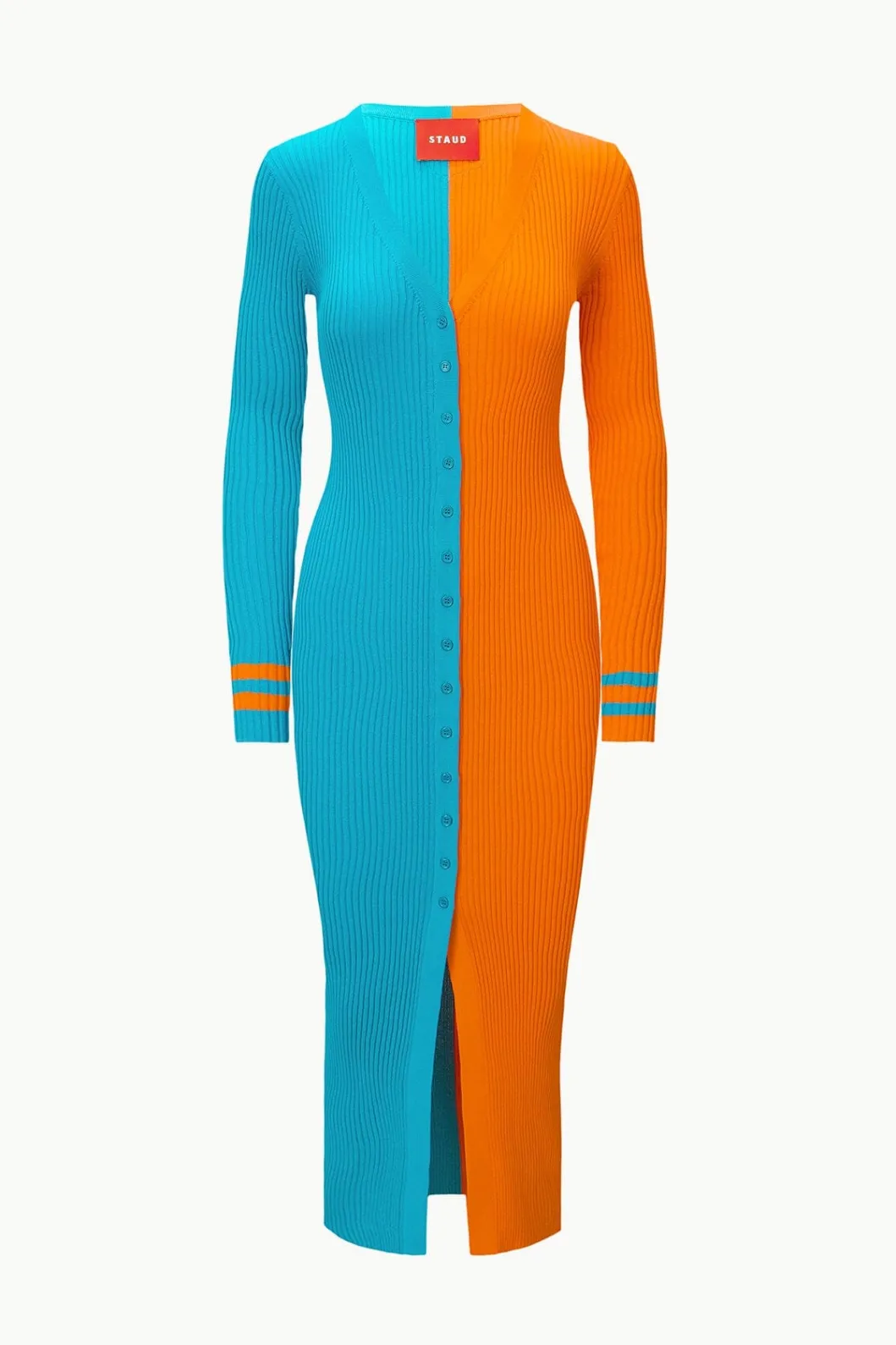 Our signature style, the Shoko Sweater, is updated to support your favorite NFL teams. The NFL STAUD Shoko Sweater is made out of our stretchy, comfortable compact rib knit fabric, and can be worn as a cardigan or a dress. This special capsule features our signature color blocked pattern and a NFL team logo on the back.