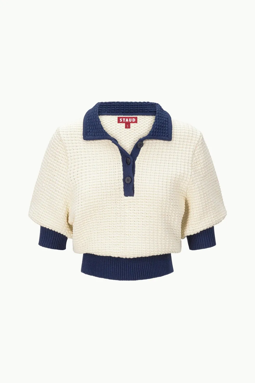 A short sleeve polo top, the Altea Sweater is made out of a chunky cotton waffle knit. This style features contrast cuffs, hem and collar.