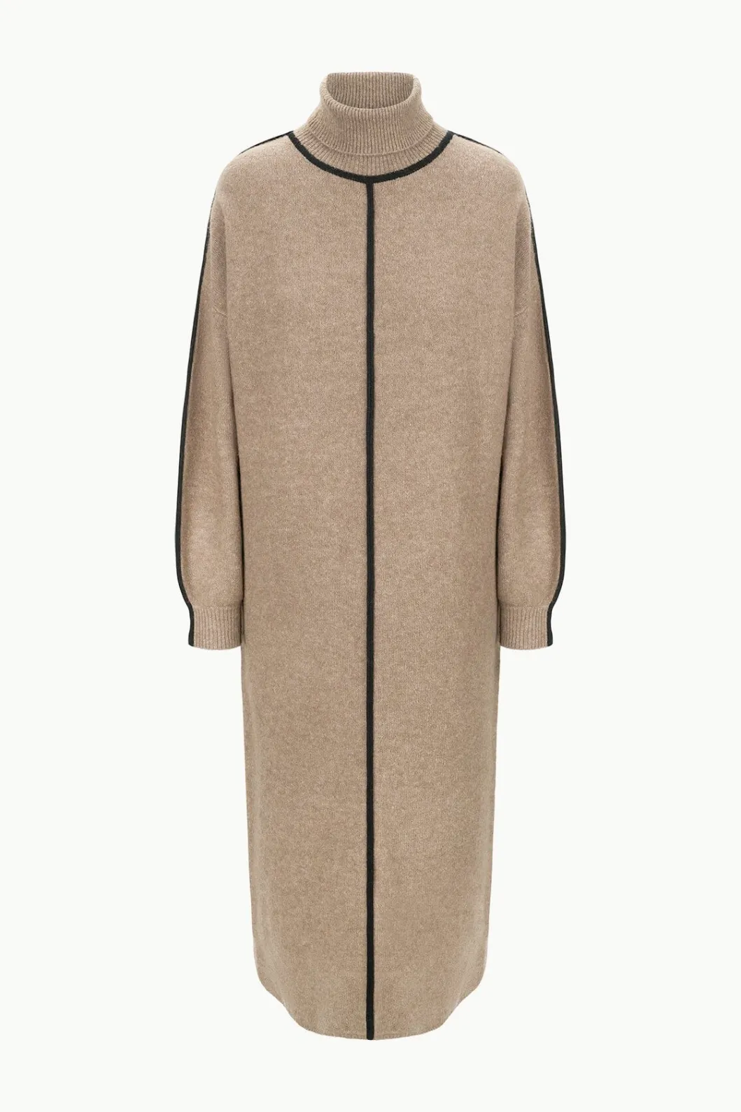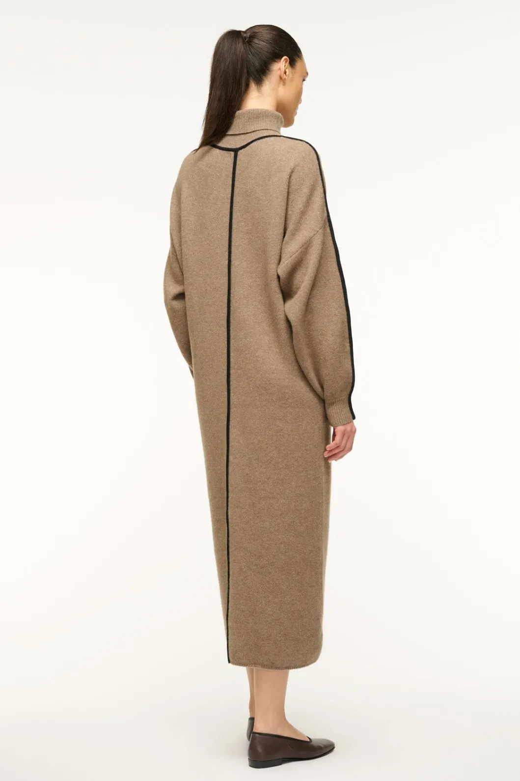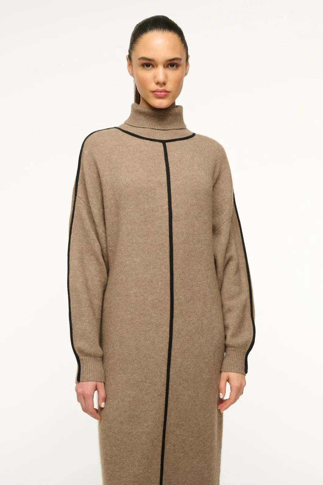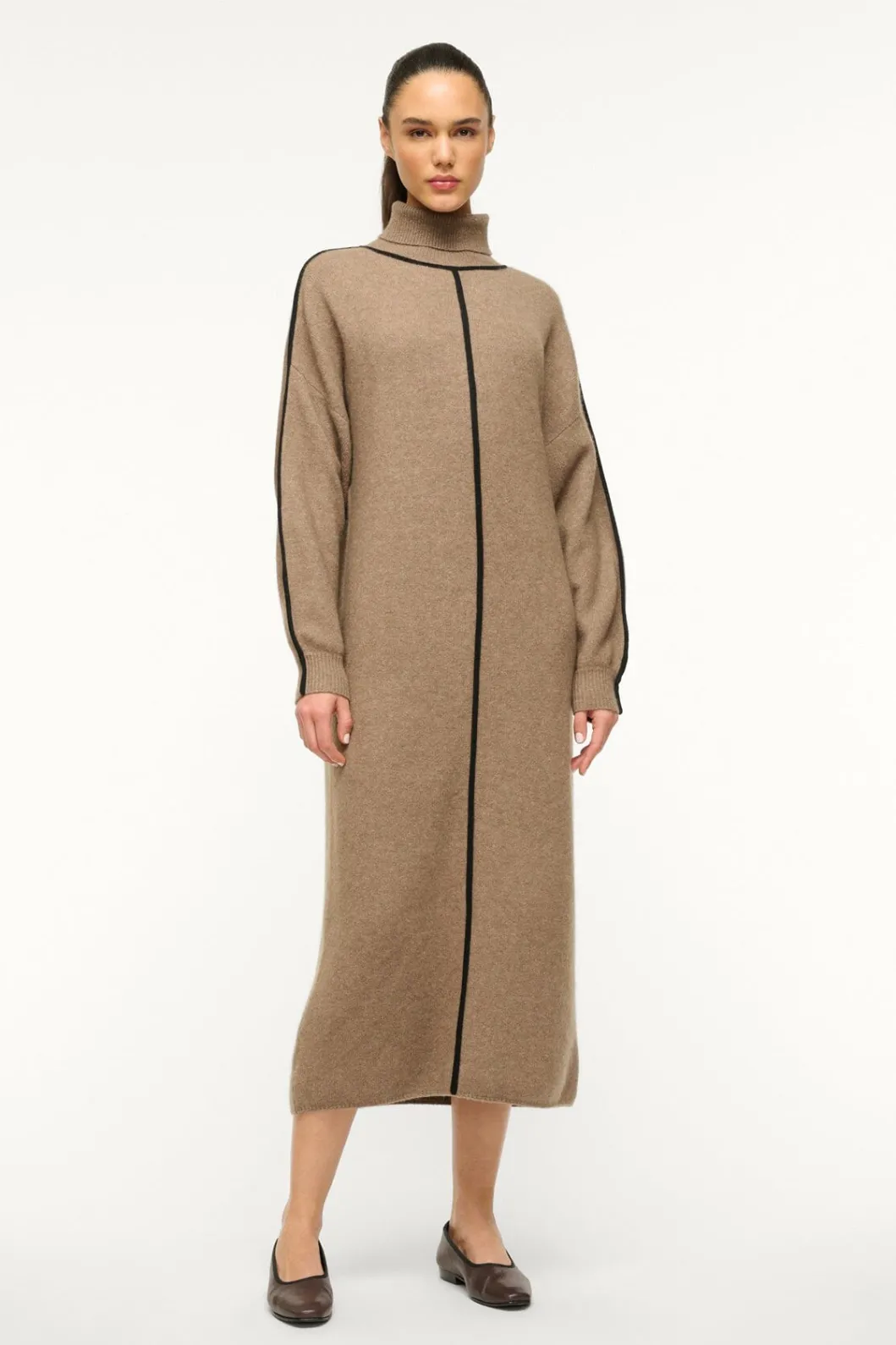 The Apres Dress is a cozy sweater dress with a turtleneck, and a contrast detail at the front, neckline, and sleeves. This style has an easy fit through the body and is a midi length.