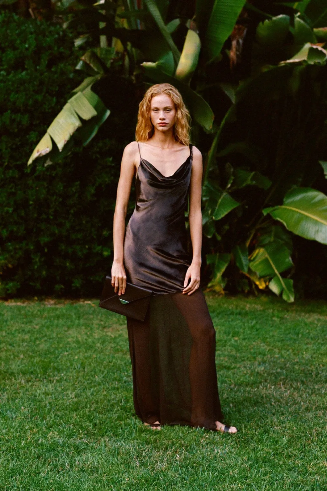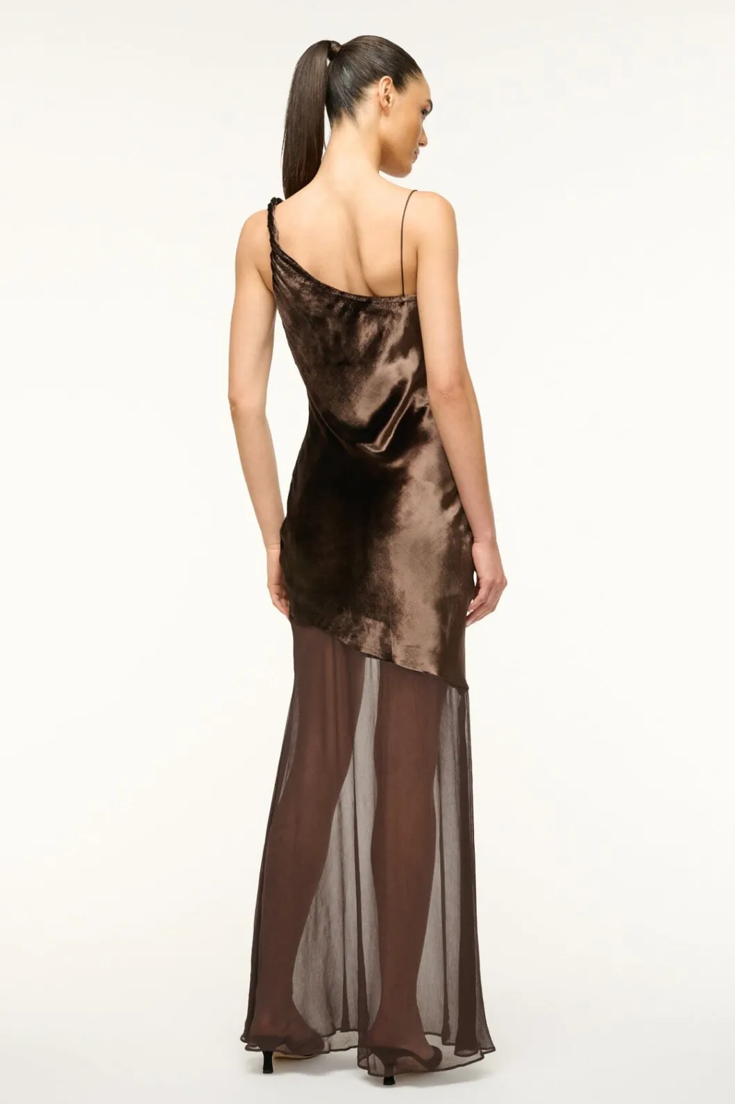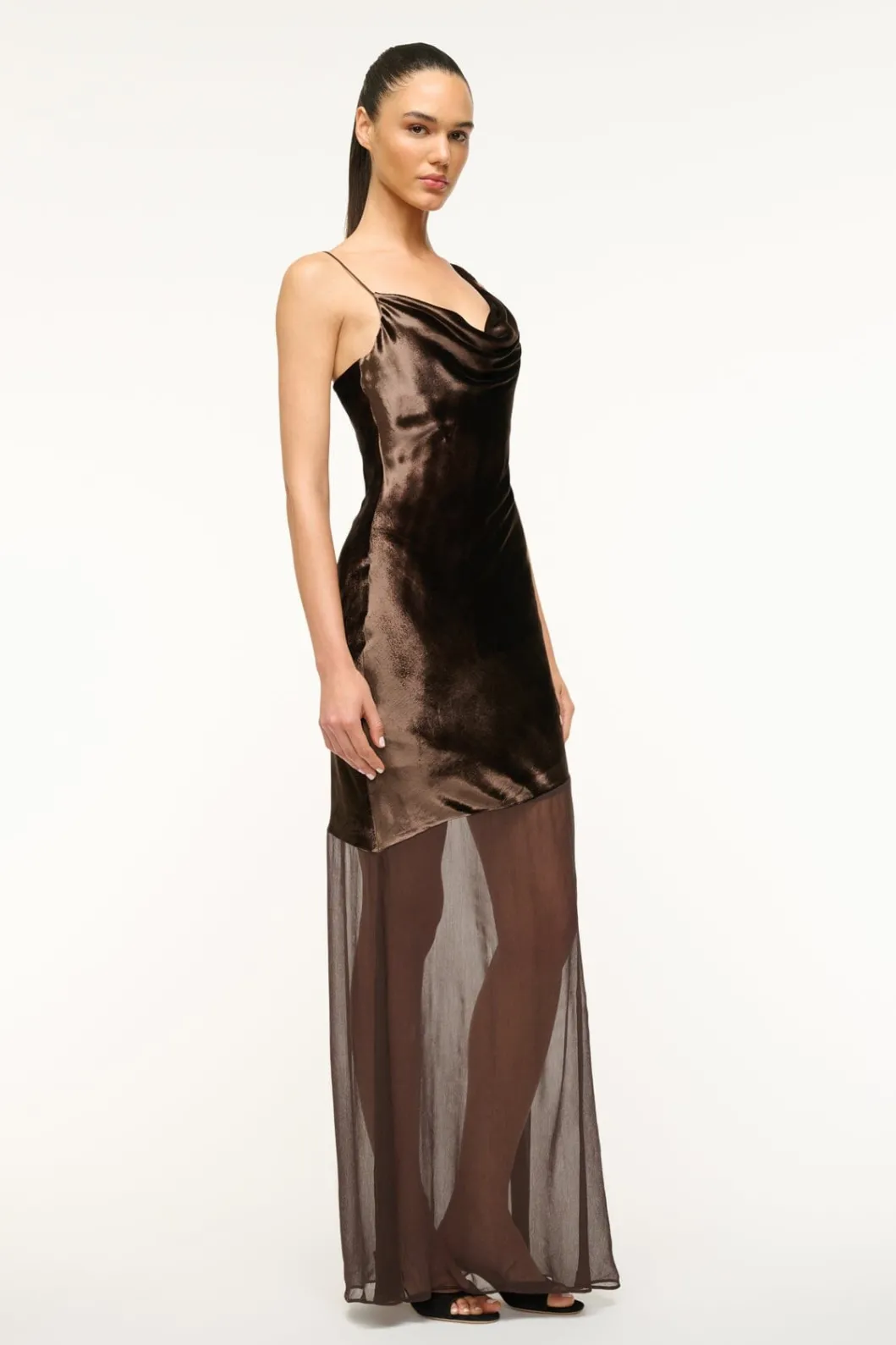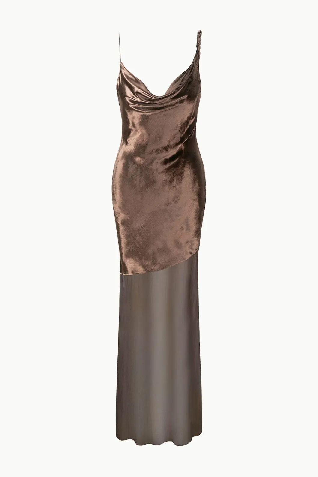 The Beaton Dress is an asymmetrical maxi-length dress with a velvet bodice that flows into a sheer crinkle chiffon skirt. It features a cowl neckline with mismatched straps and an open upper back.