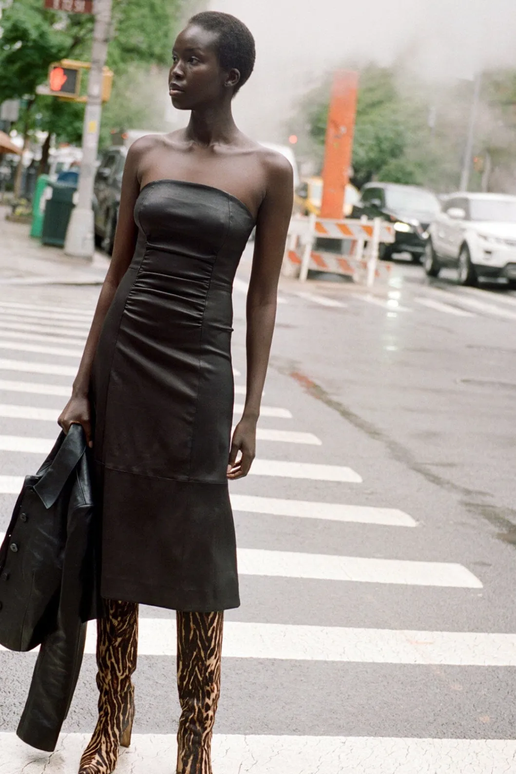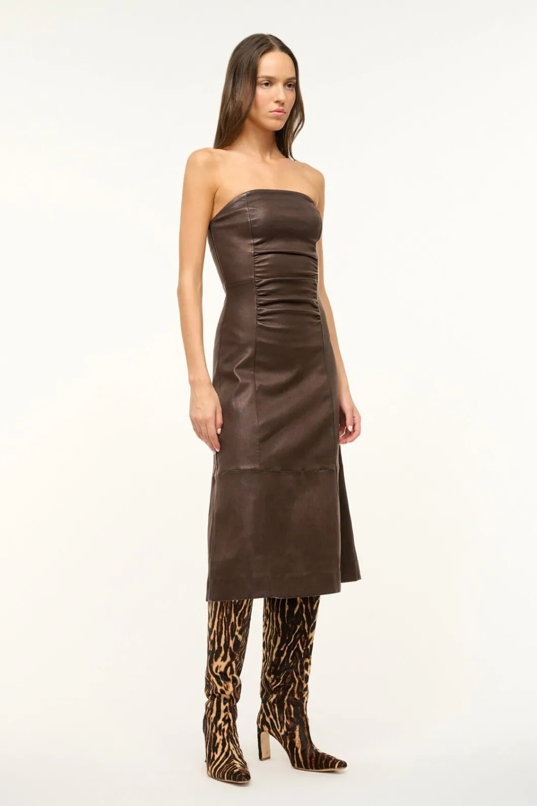 A strapless dress crafted from a soft, stretch nappa leather. The Bowery features gathering through the bodice and an a-…