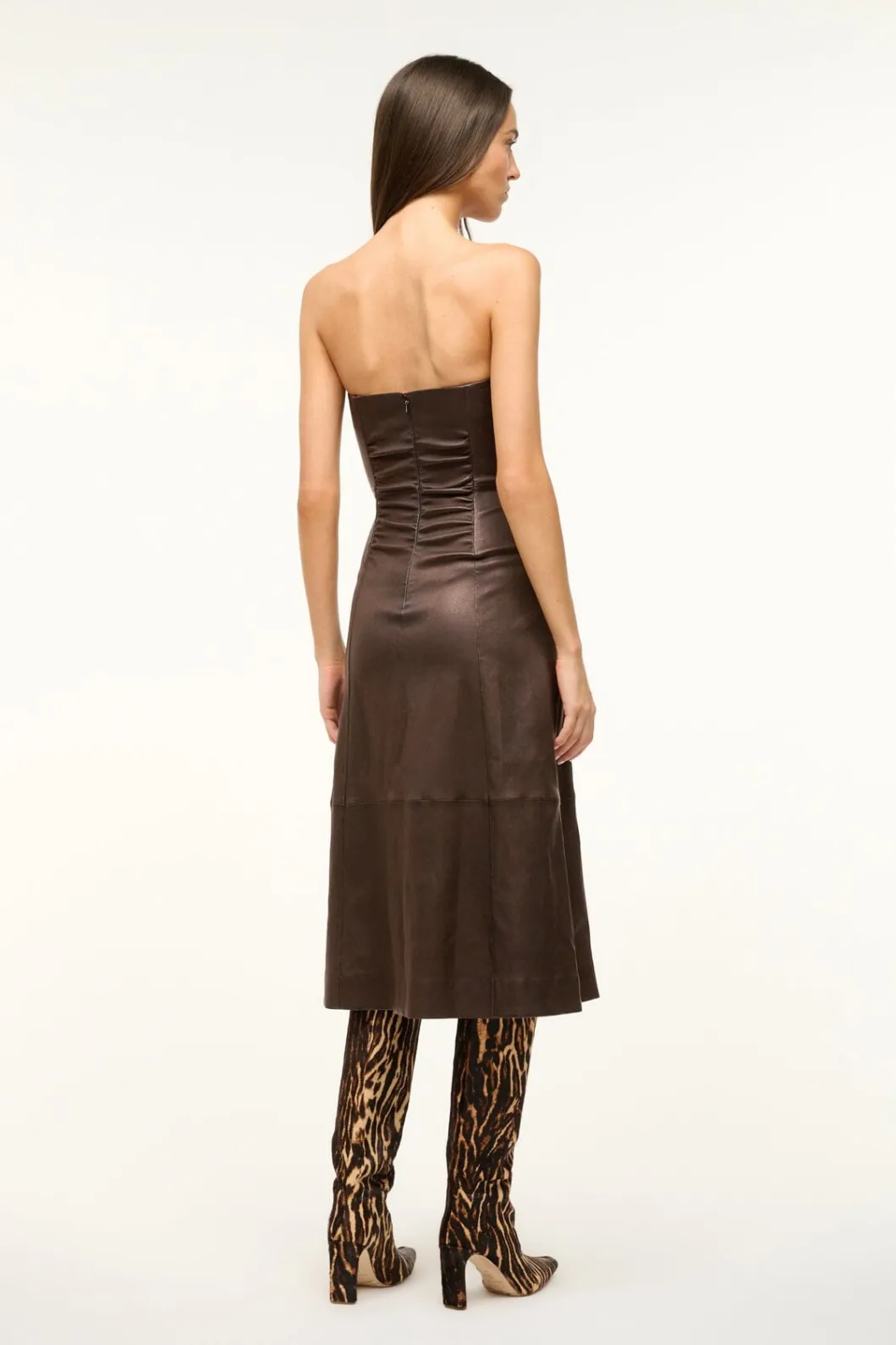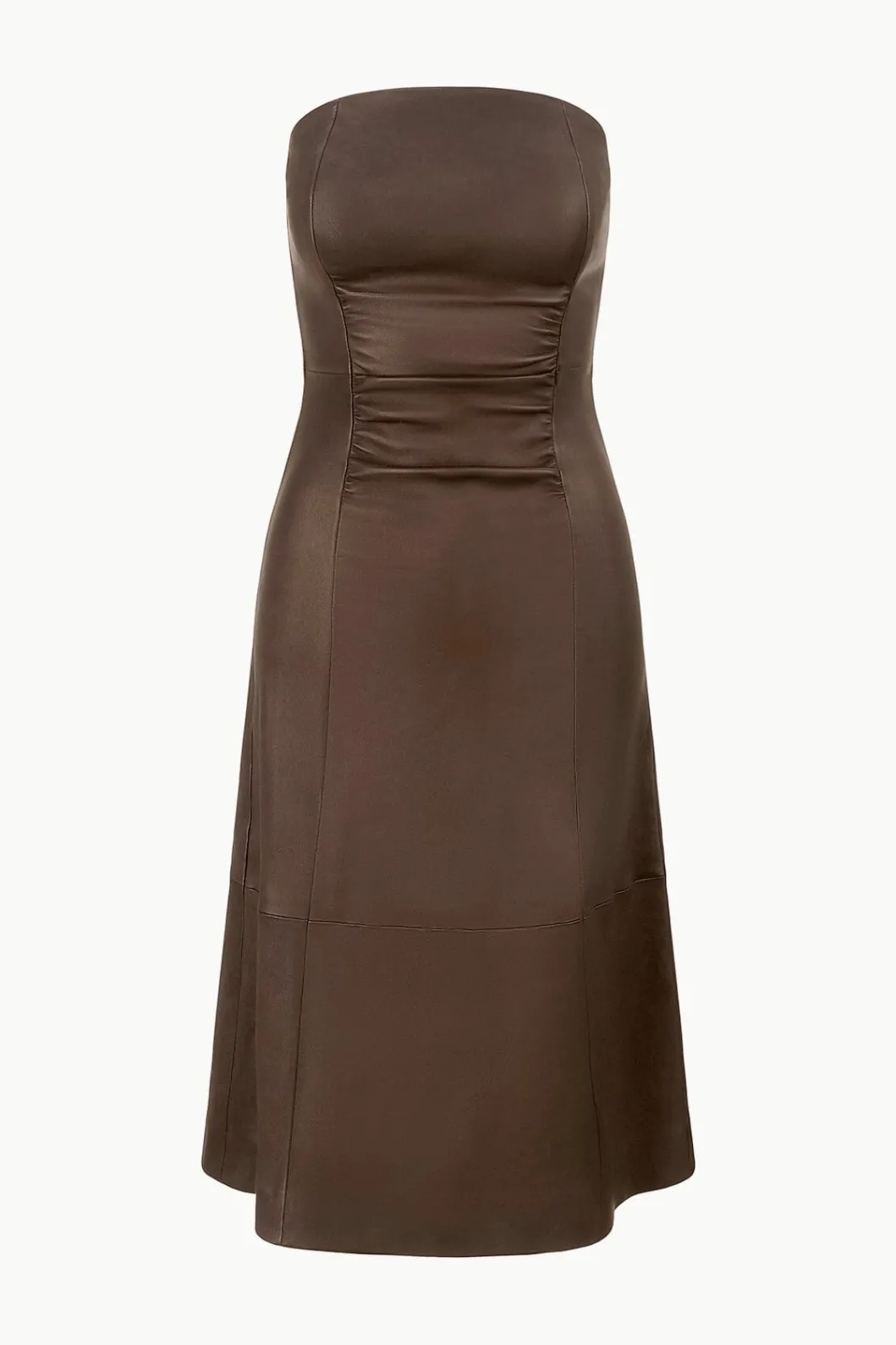 A strapless dress crafted from a soft, stretch nappa leather. The Bowery features gathering through the bodice and an a-line skirt.