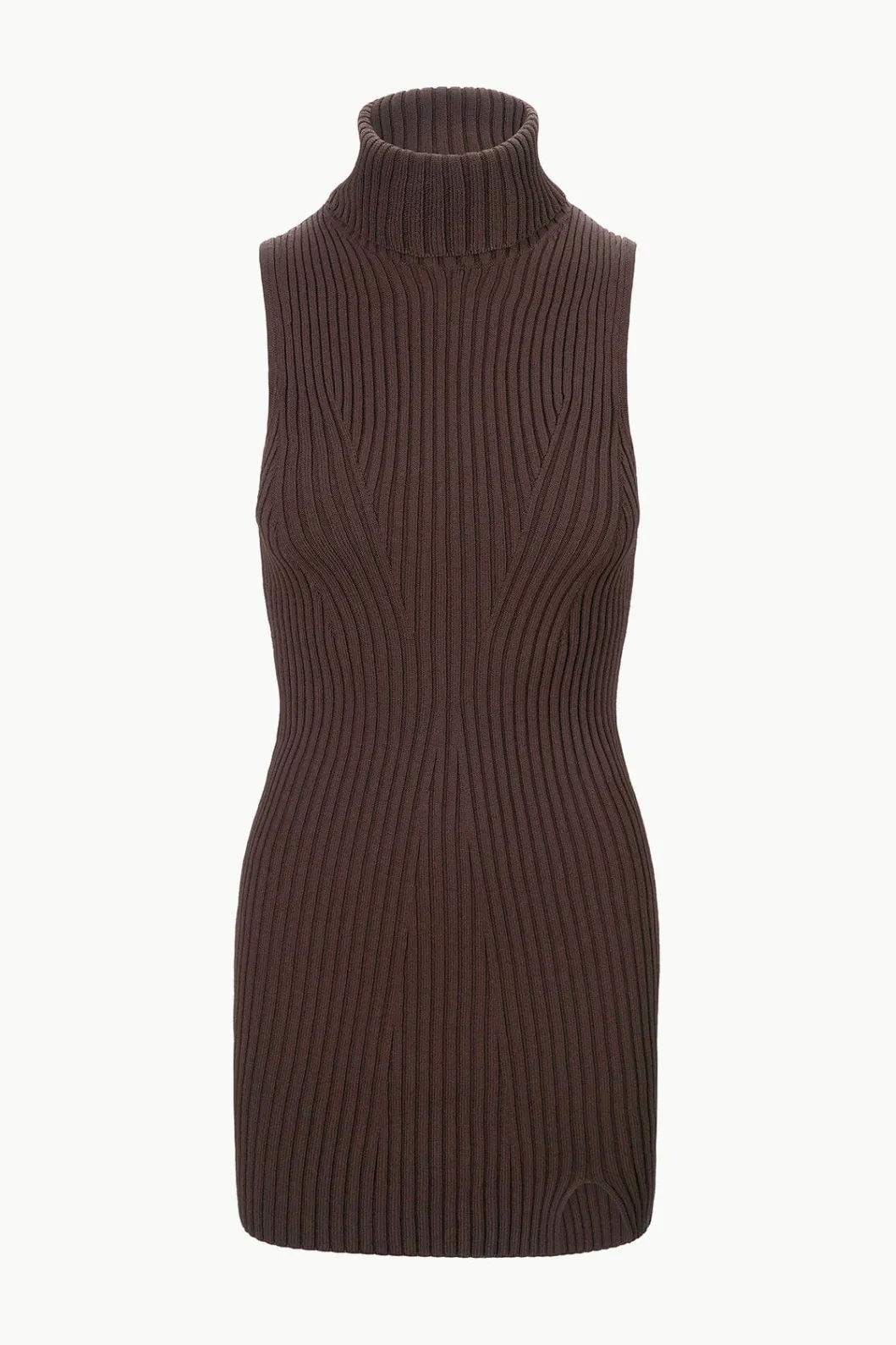 A sleeveless turtleneck sweater dress made from a ribbed knit fabric with a fitted silhouette and side slit.