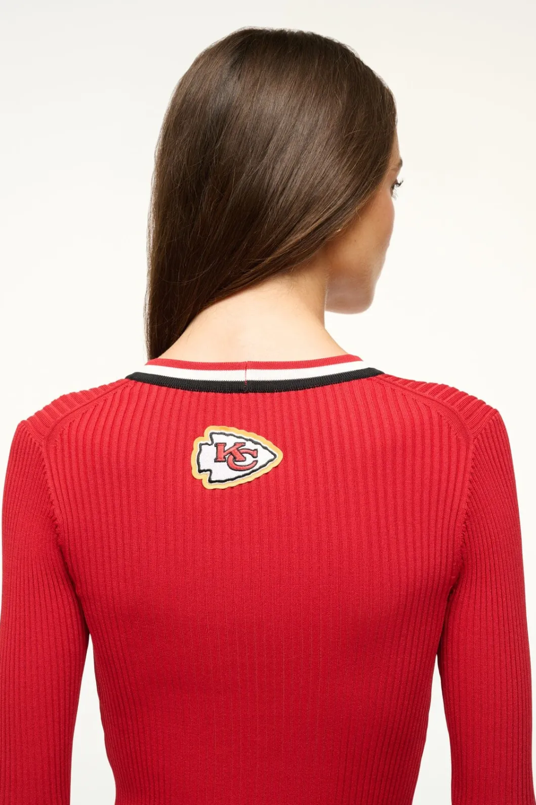 Our signature style, the Shoko Sweater, is updated to support your favorite NFL teams. The NFL STAUD Shoko Sweater is made out of our stretchy, comfortable compact rib knit fabric, and can be worn as a cardigan or a dress. This special capsule features a NFL team logo on the back.