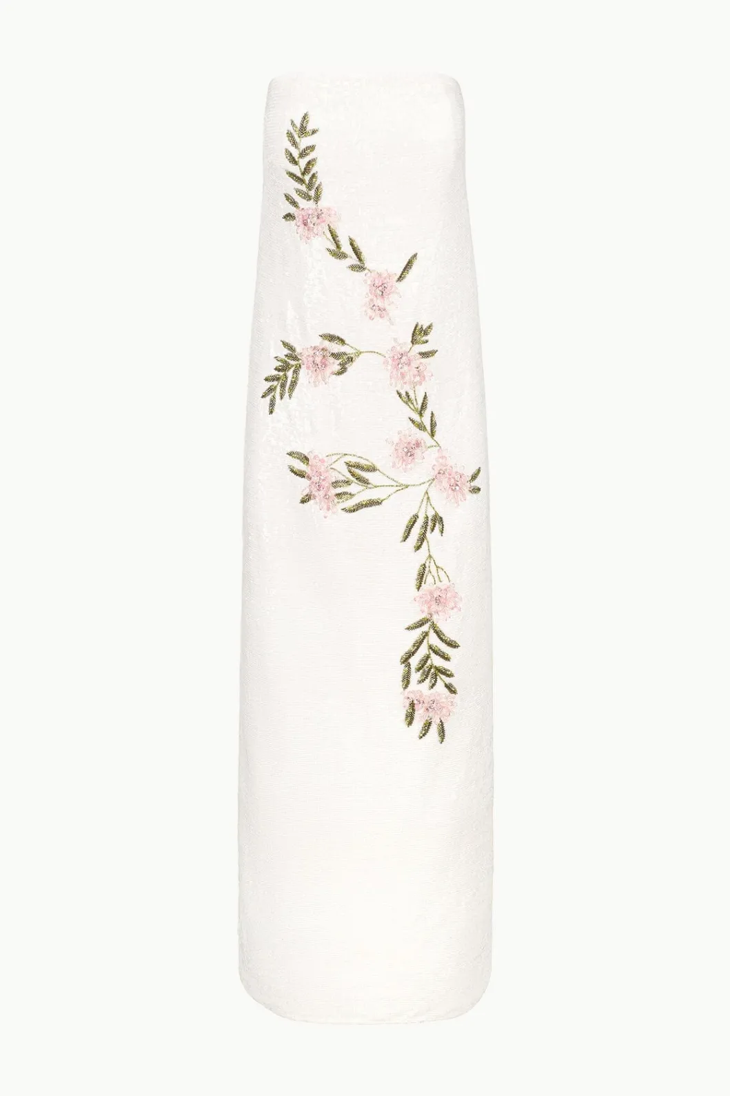 Our sequined Casey Dress has been updated for the season with a beaded floral motif across the bodice. It features a relaxed silhouette throughout the body, a back slit, and a hidden zipper.
