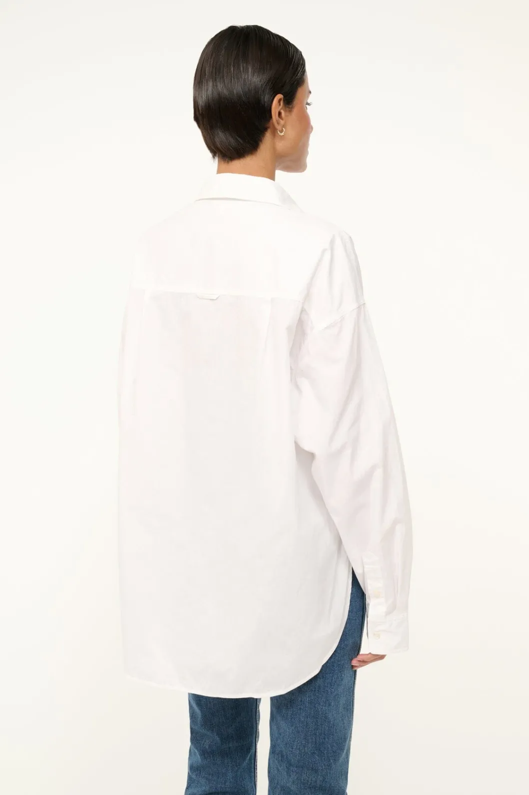 An oversized collared shirt with a single patch pocket in a cotton poplin fabric.