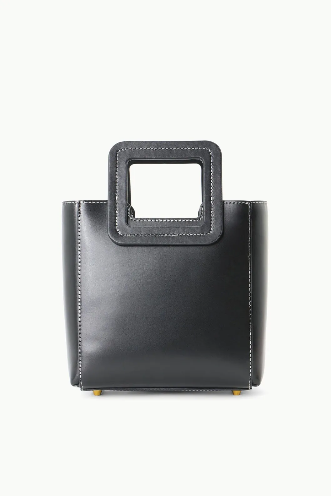 The Mini Shirley Leather Bag features a zipper closure, antique gold hardware, and suede lining.