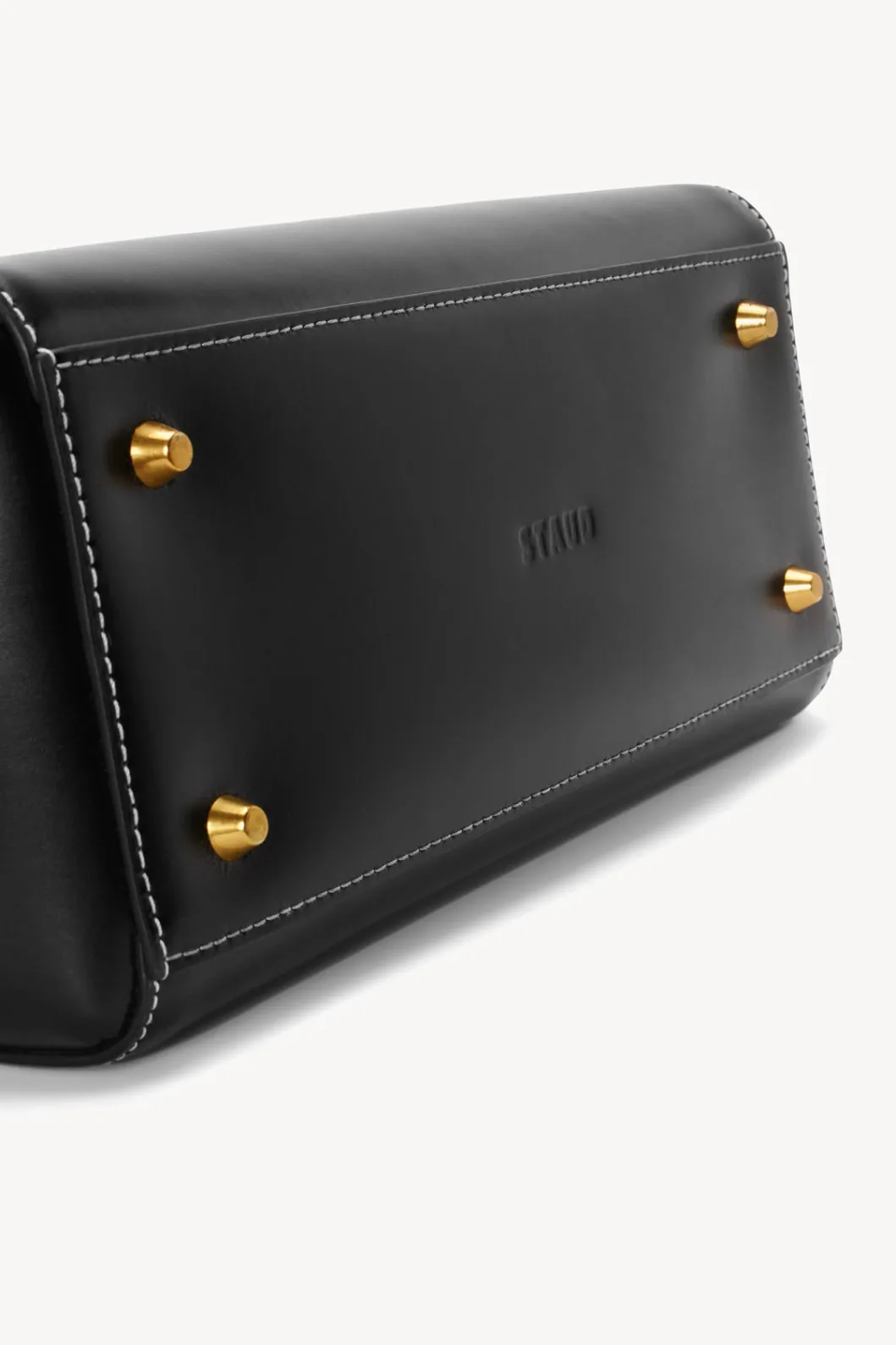 The Shirley Leather Bag features a zipper closure, antique gold hardware, and suede lining.