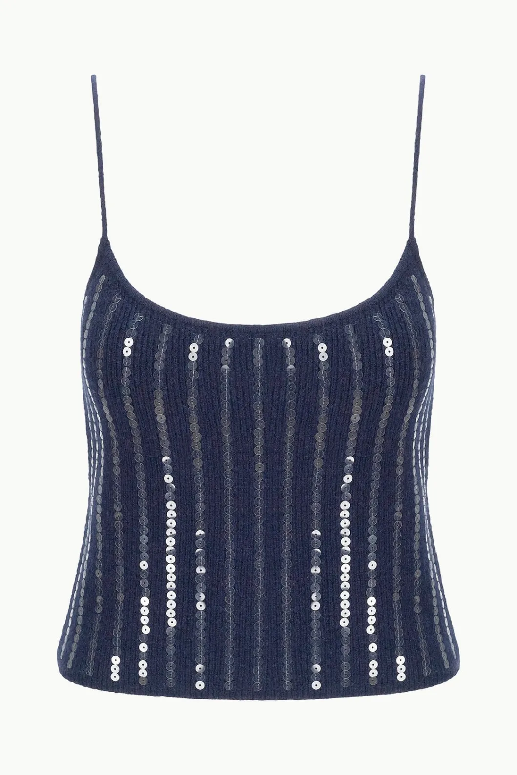 A fuzzy knit camisole with sequin embroidery perfect for any Holiday occasion. The Emerson Tank features adjustable straps and completes a coordinating look with the matching Mimi Skirt.