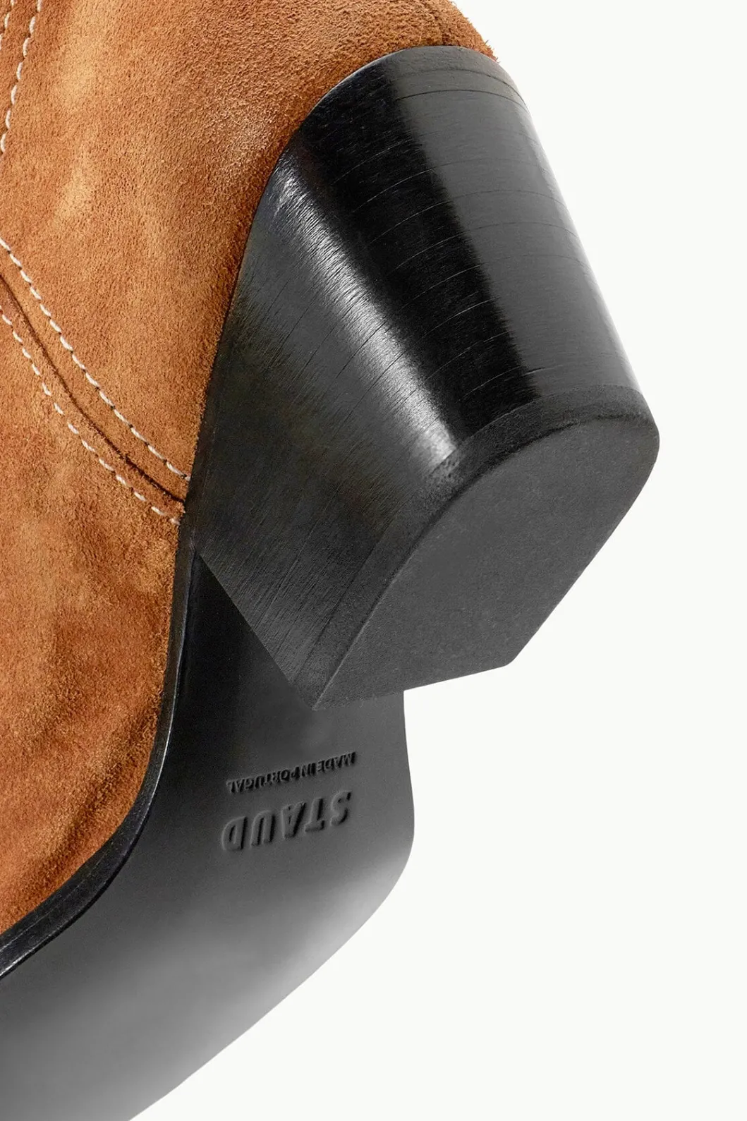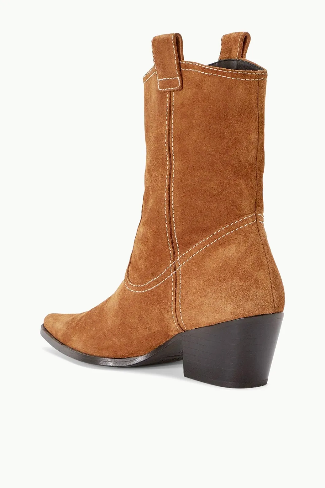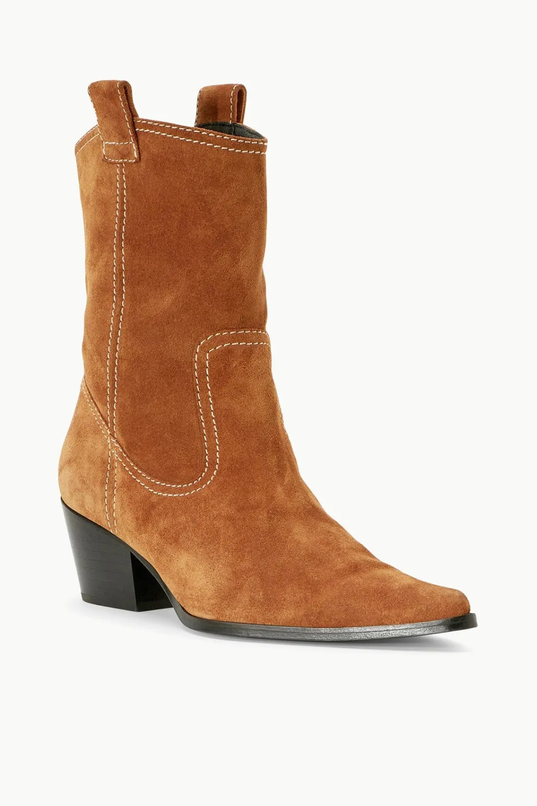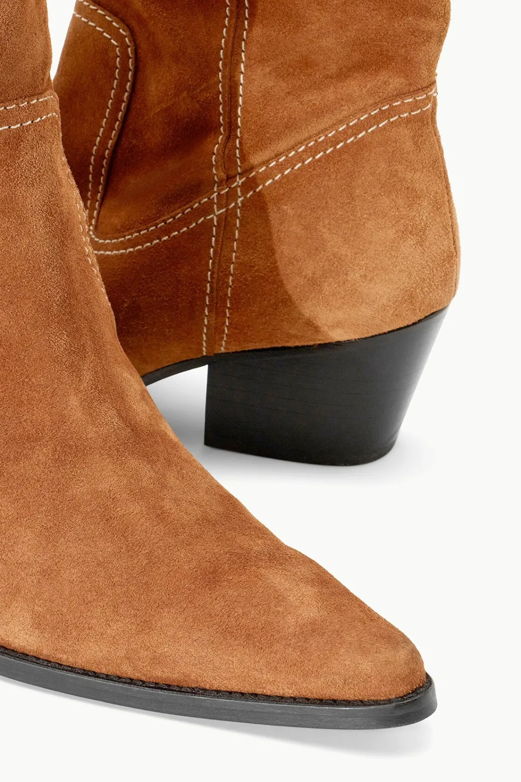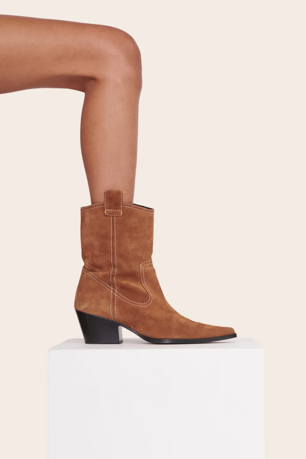 New for the season, the June is a true pointed toe cowboy boot made from soft suede with contrast stitching. This style features western seaming and cuban heel.