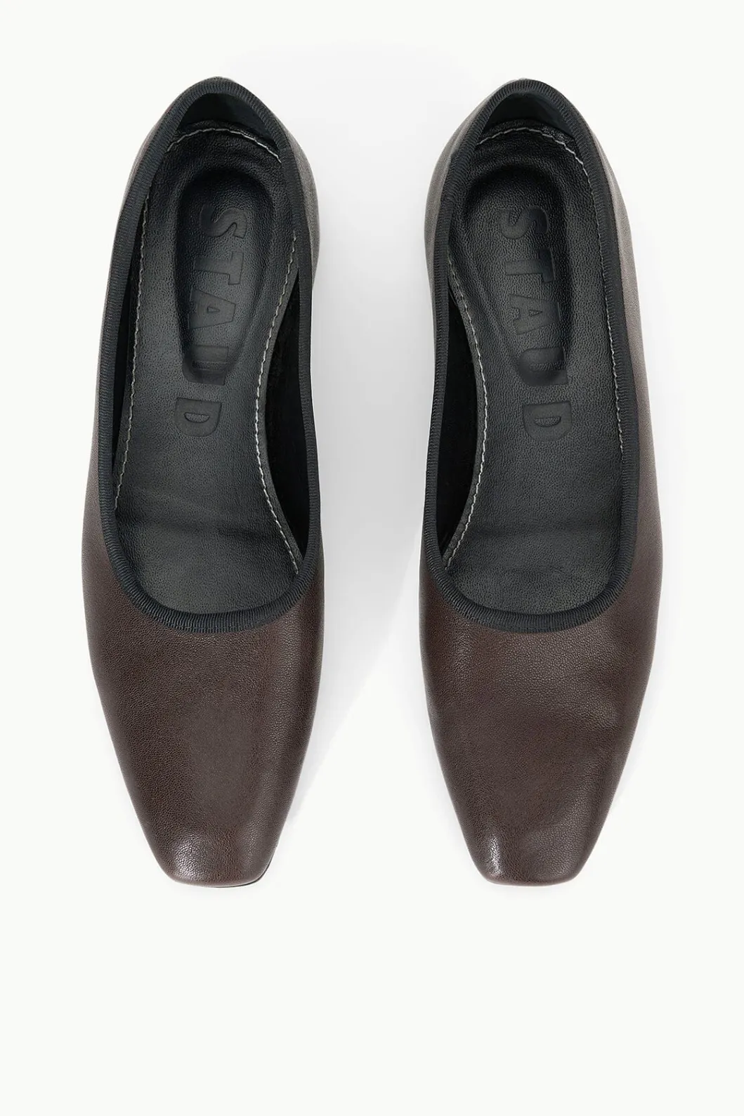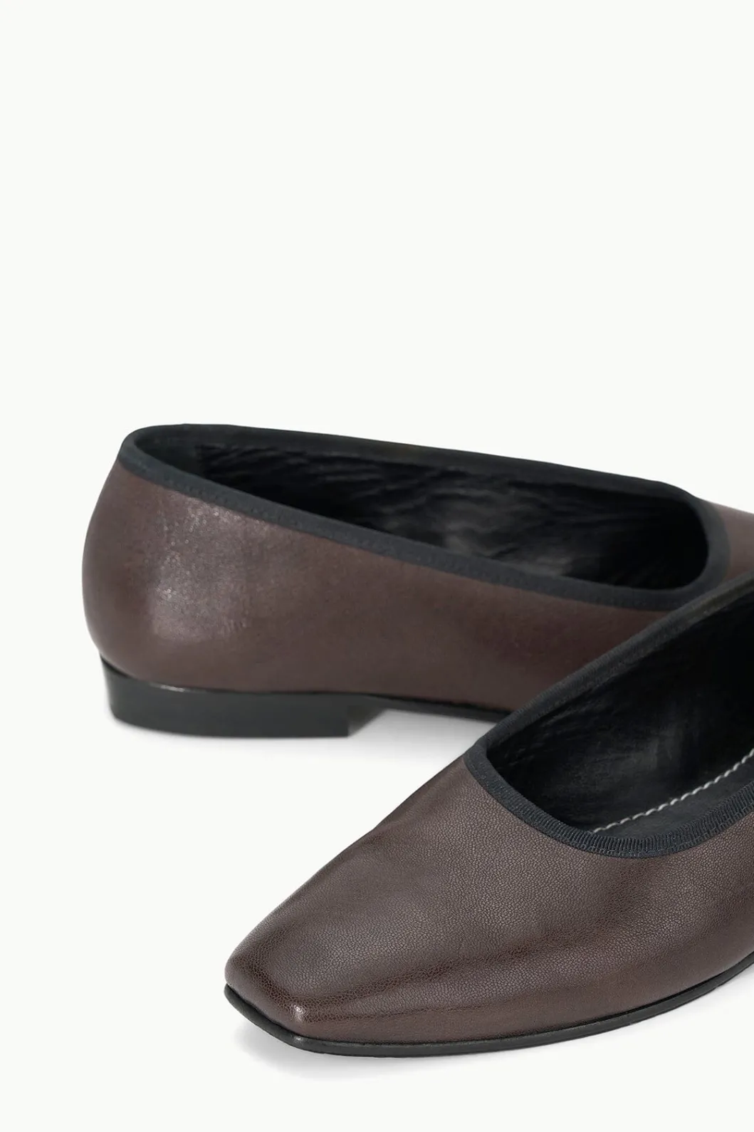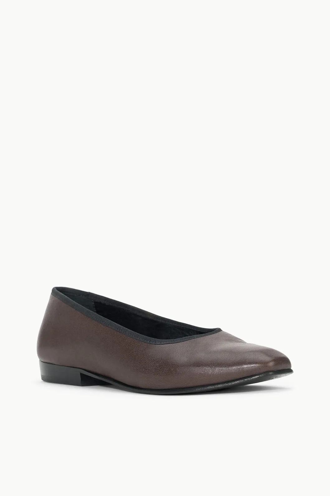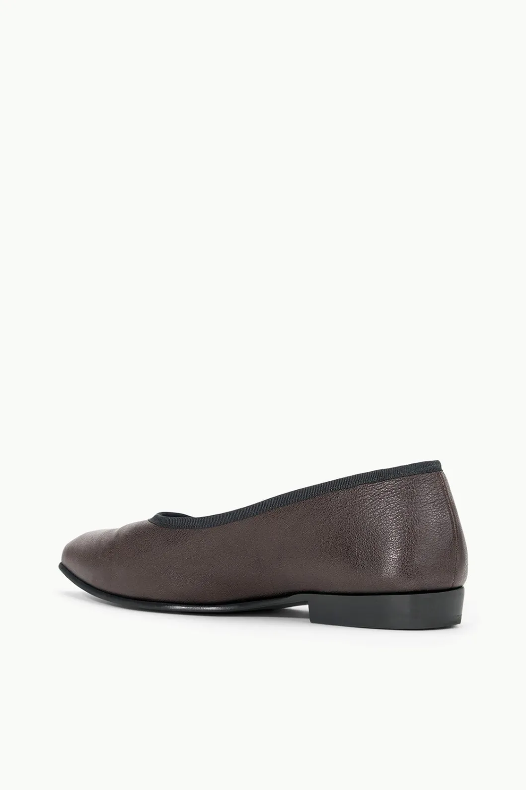 The Keith Ballet Flat is a leather flat with grosgrain trim featuring an elongated squared off toe.