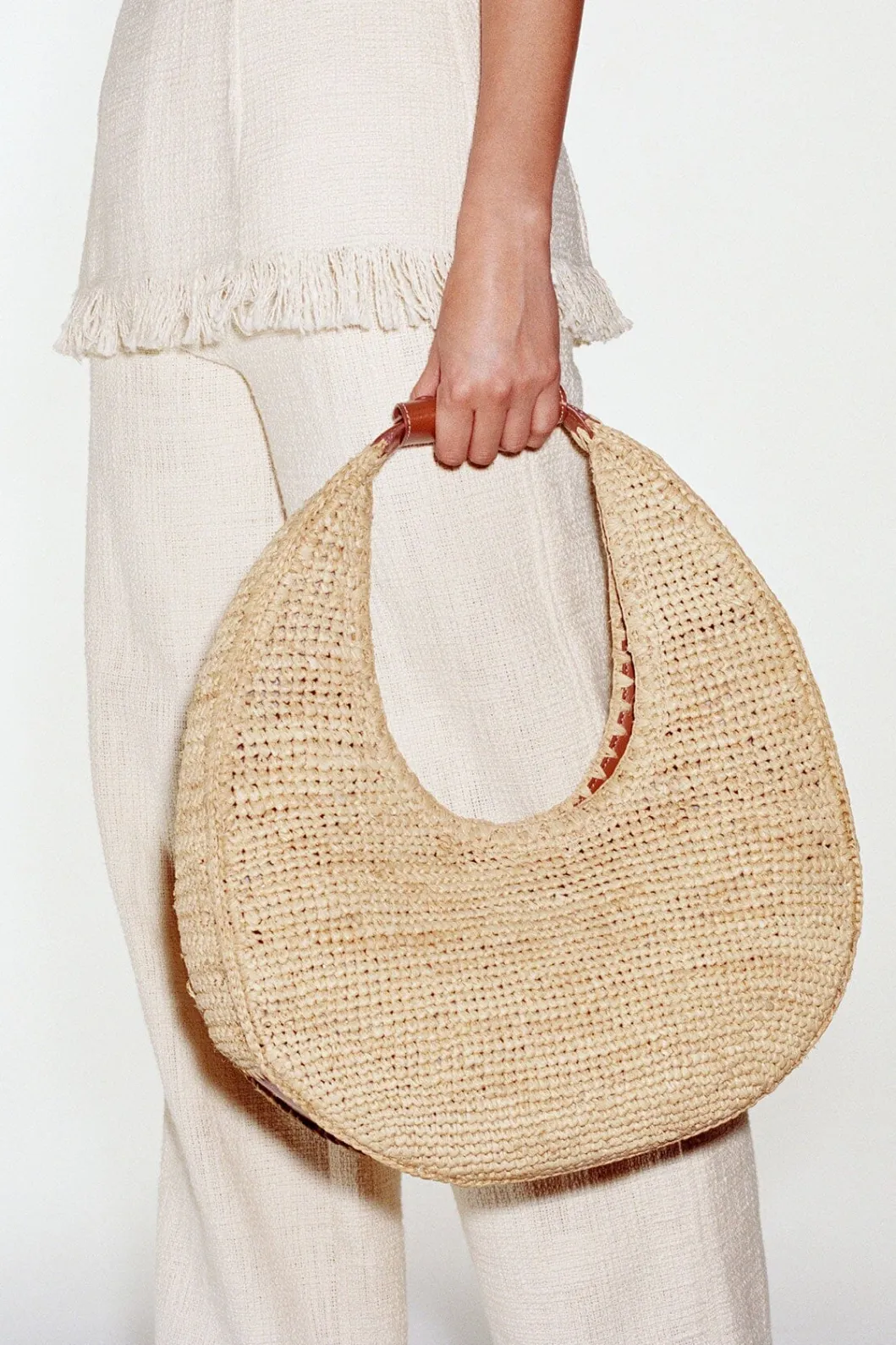 An oversized addition to our Moon family, the Large Raffia Moon is the perfect vacation tote. This style is made from h…