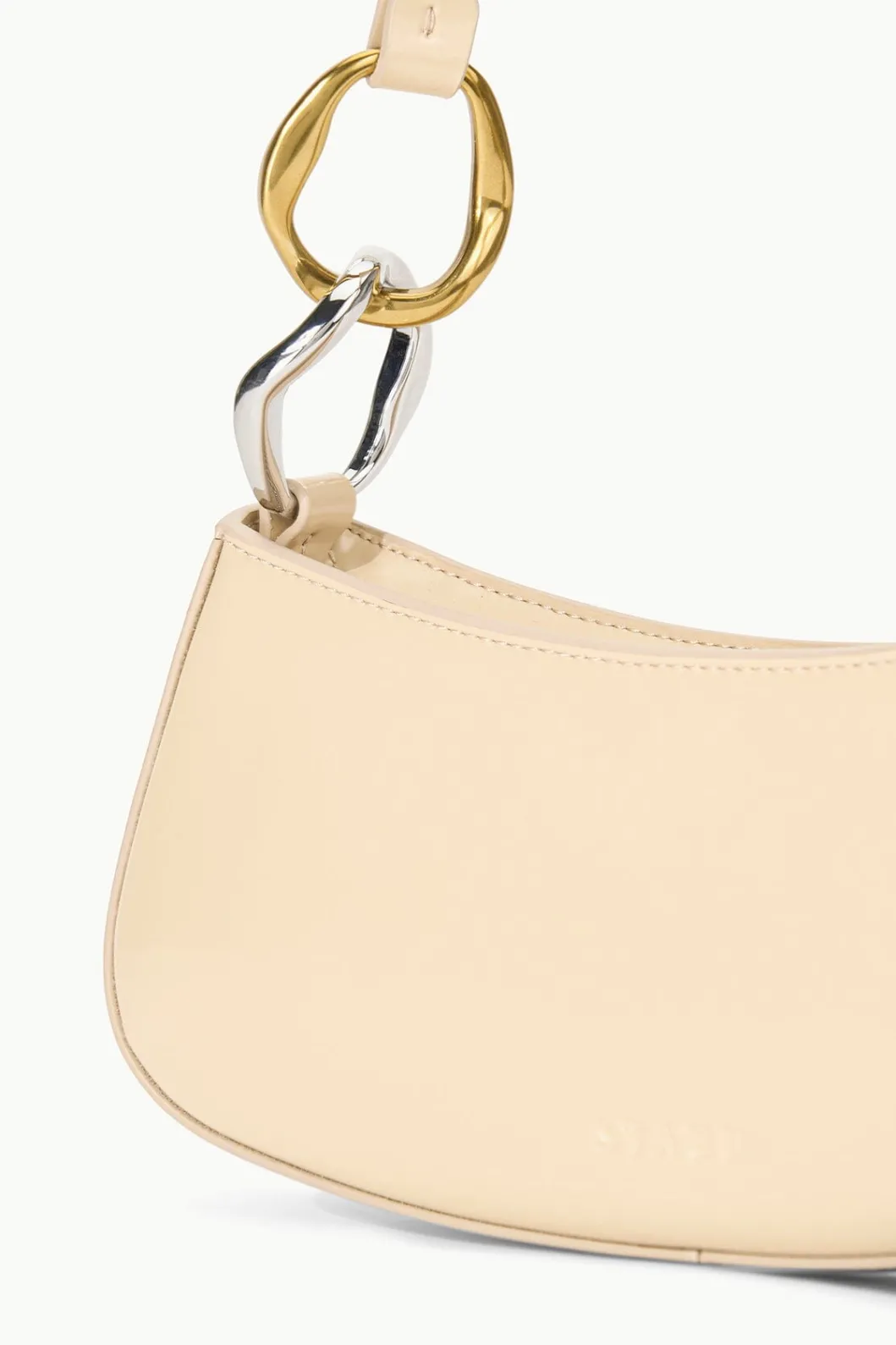 The Ollie Bag is a mini shoulder bag made out of polished leather. This style features mixed metal hardware on the strap…