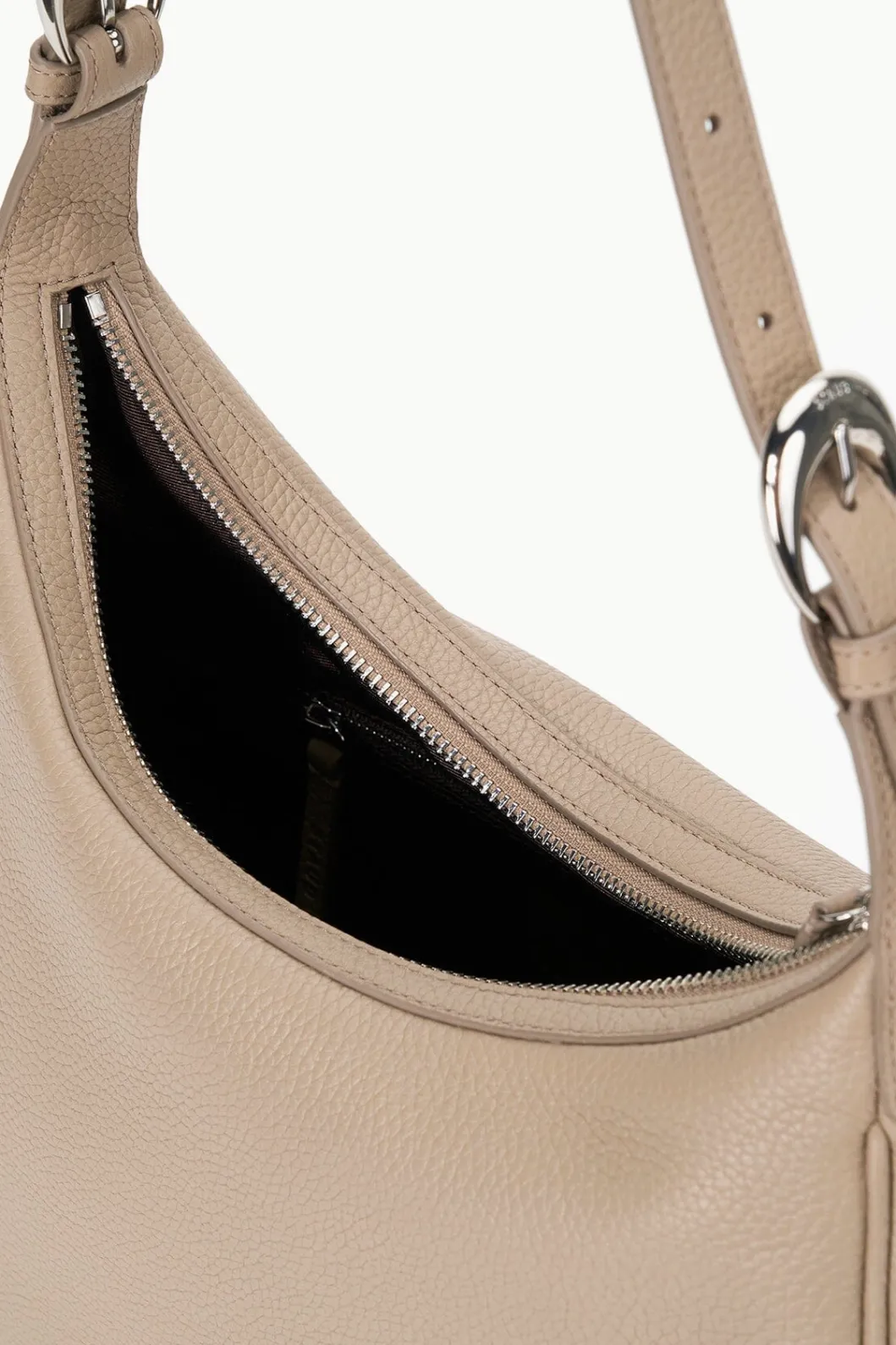 The Pine Hobo is a pebbled leather bag with two moon shaped buckles and an adjustable shoulder strap. It features a zipper closure and an interior zipper pocket to safely store your daily essentials.
