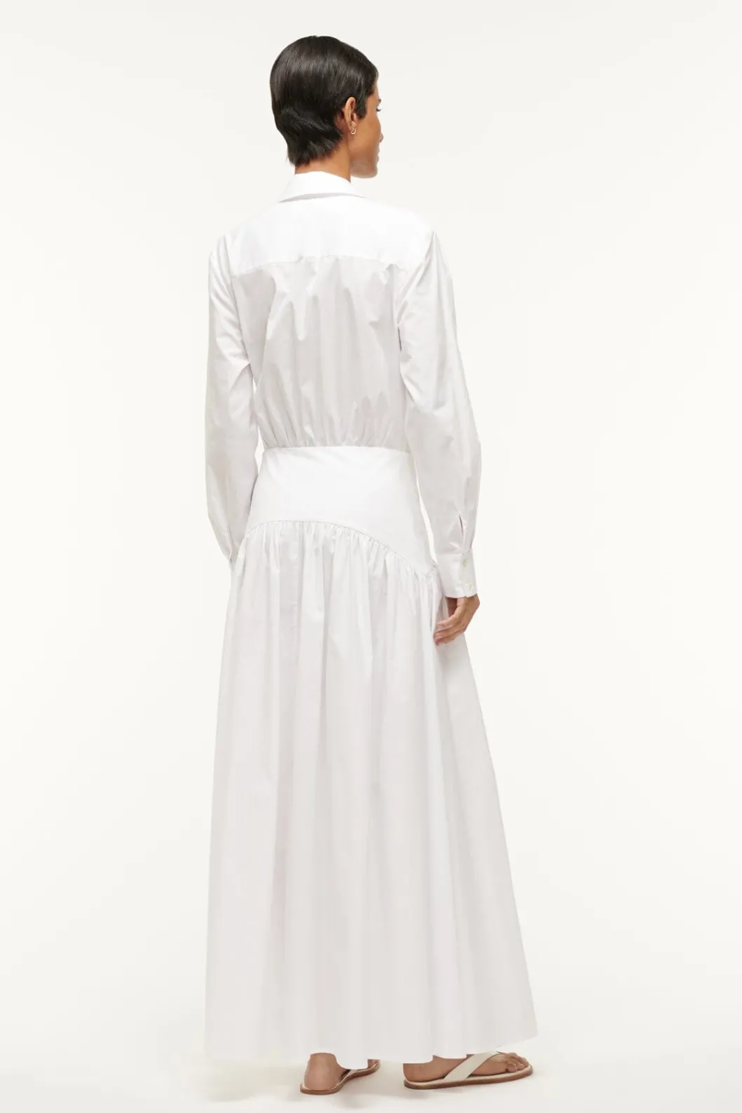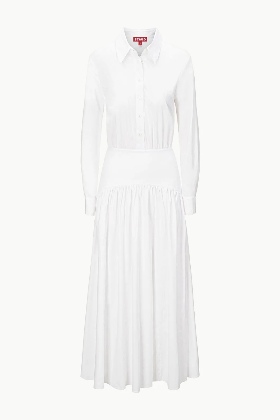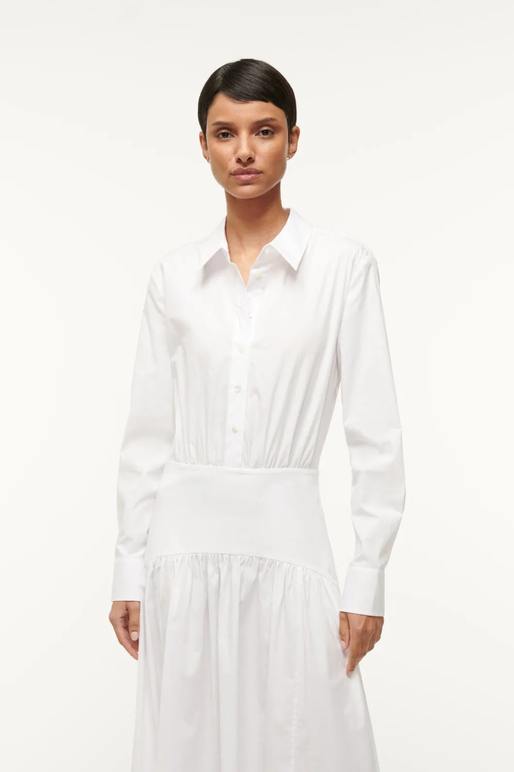 A maxi long sleeve shirt dress made out of our slightly stretchy cotton poplin fabric. This style features an a-line skirt and curved yoke at the hip.