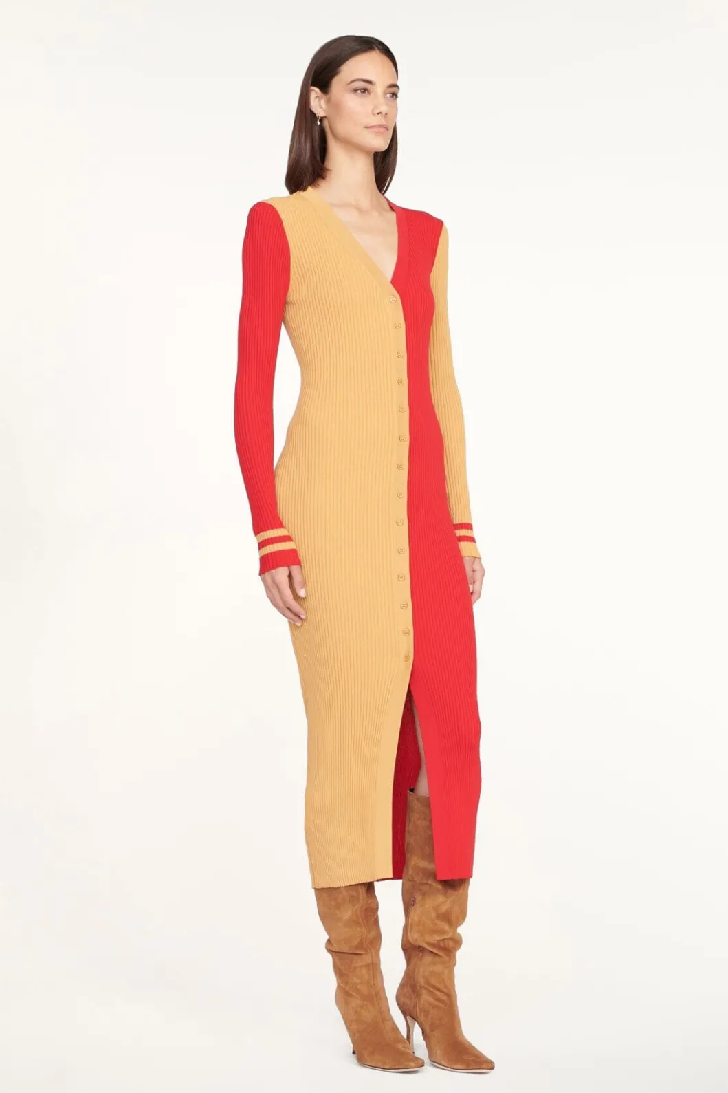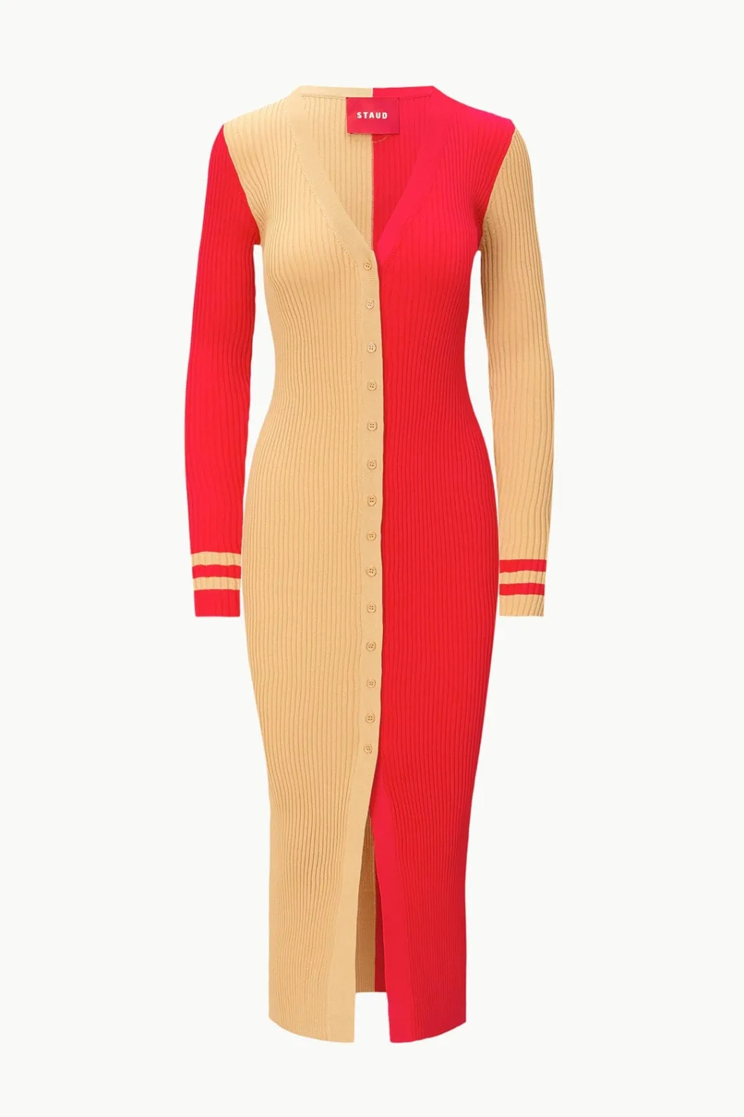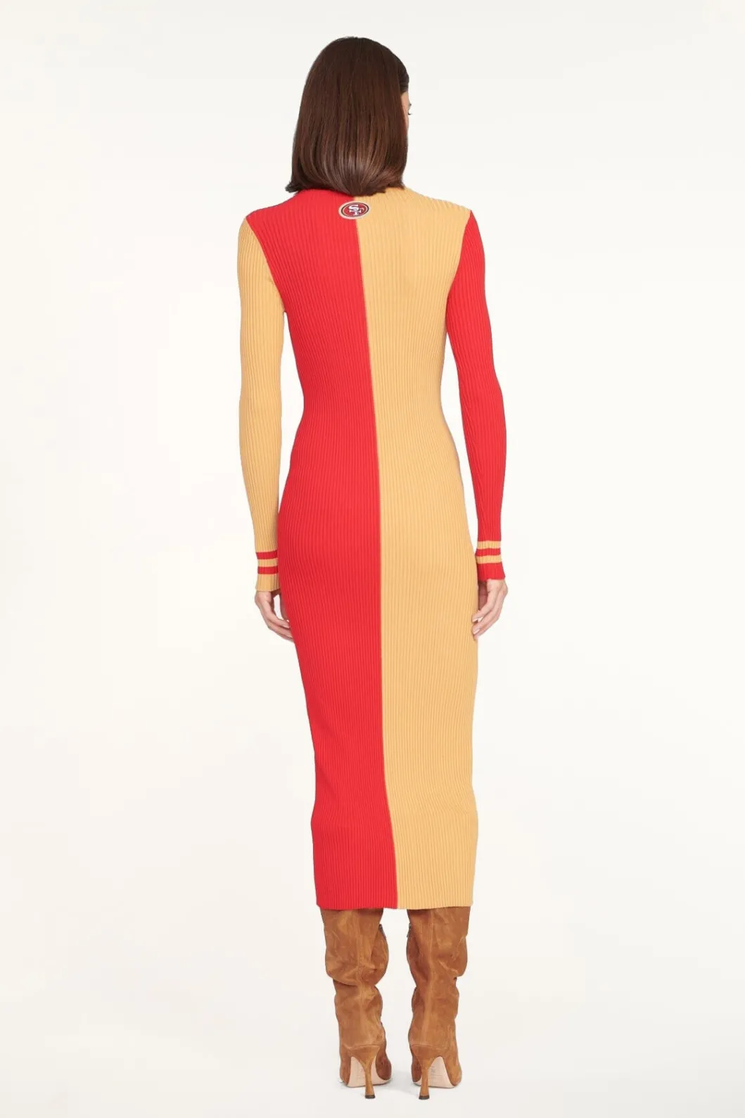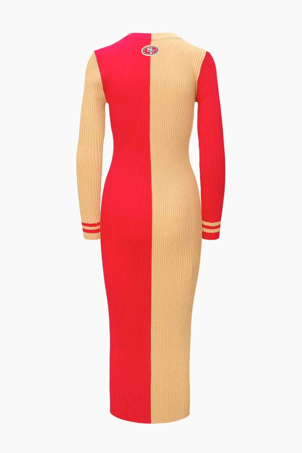 Our signature style, the Shoko Sweater, is updated to support your favorite NFL teams. The NFL STAUD Shoko Sweater is made out of our stretchy, comfortable compact rib knit fabric, and can be worn as a cardigan or a dress. This special capsule features our signature color blocked pattern and a NFL team logo on the back.