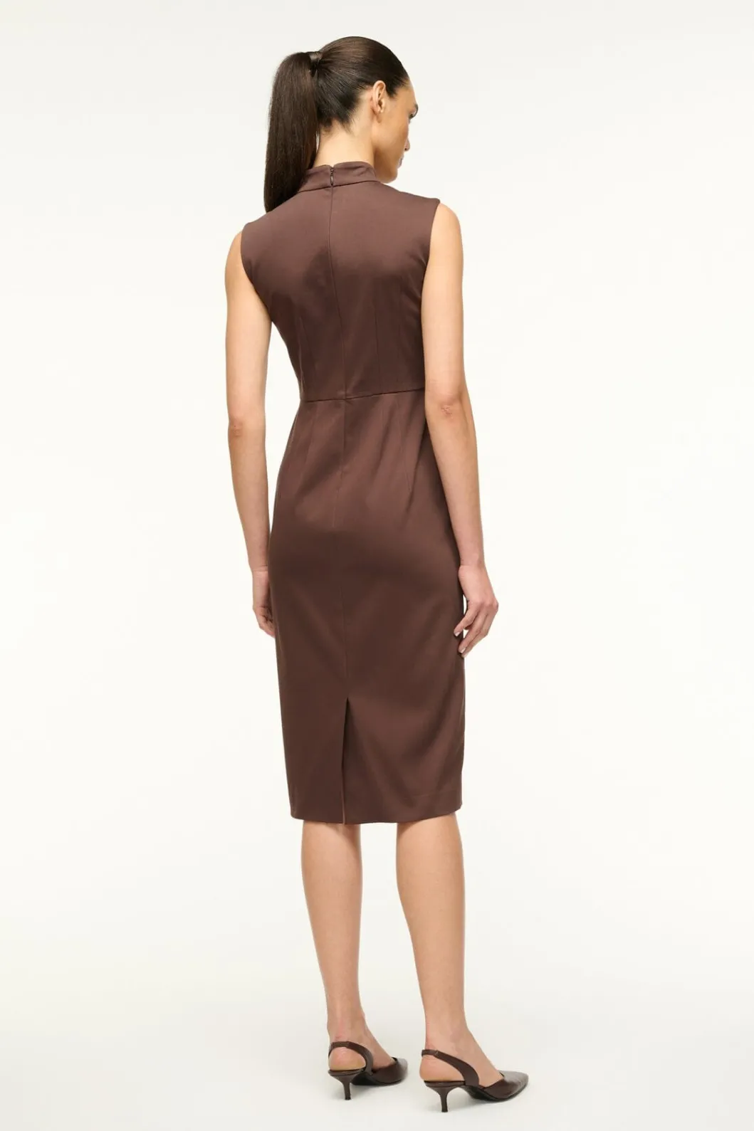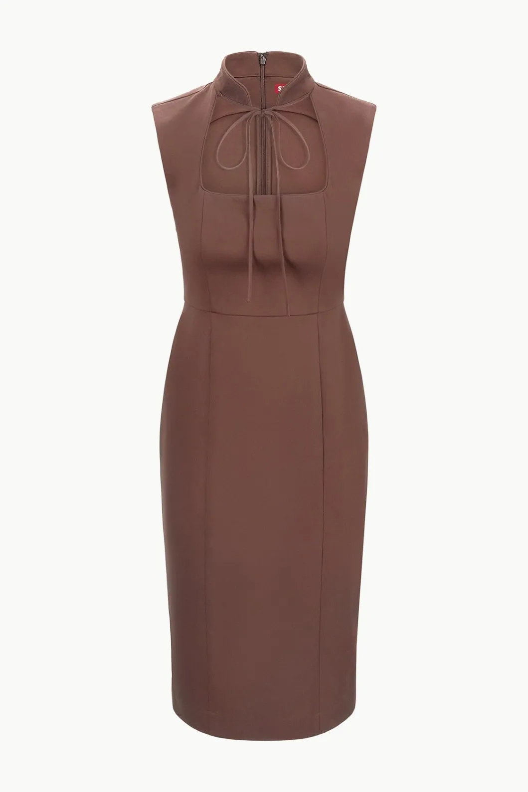 The Mariano Dress is a bustier inspired dress with cut out neckline, mandarin collar, and self ties. This is a slim fitt…