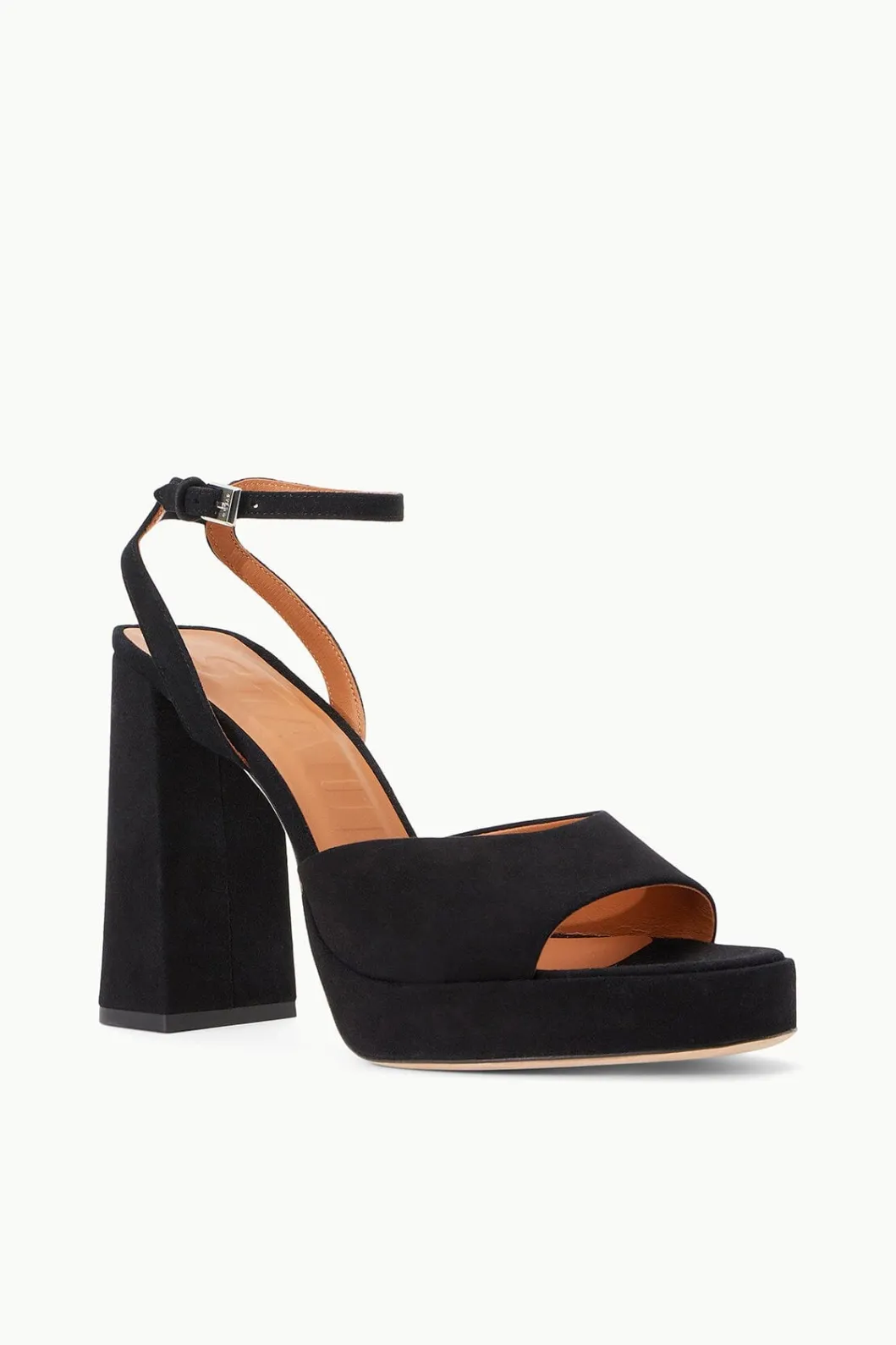 An open-toe platform made from suede, the Solange features a chunky covered heel heel and buckle closure ankle strap.