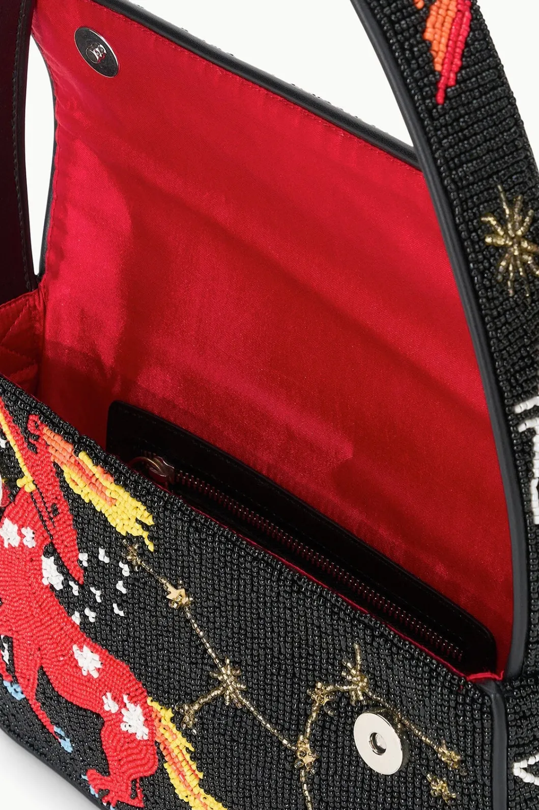 Twelve new beaded Tommy bags inspired by the star signs of the zodiac. This style is hand beaded and features vegan leather piping, a magnetic snap closure and has a pocket on the back.