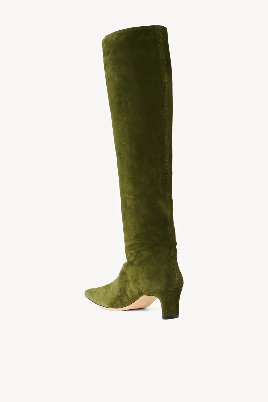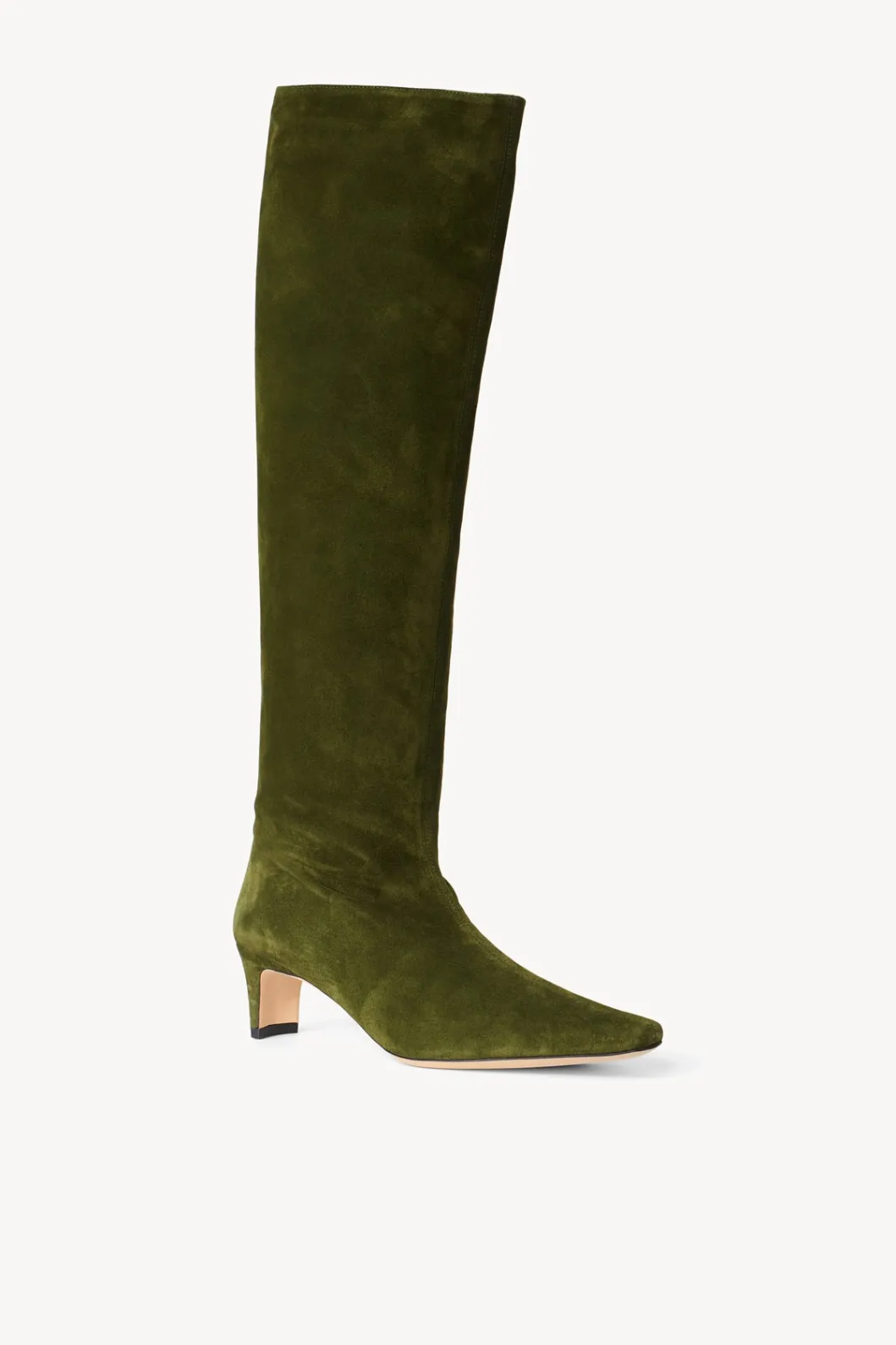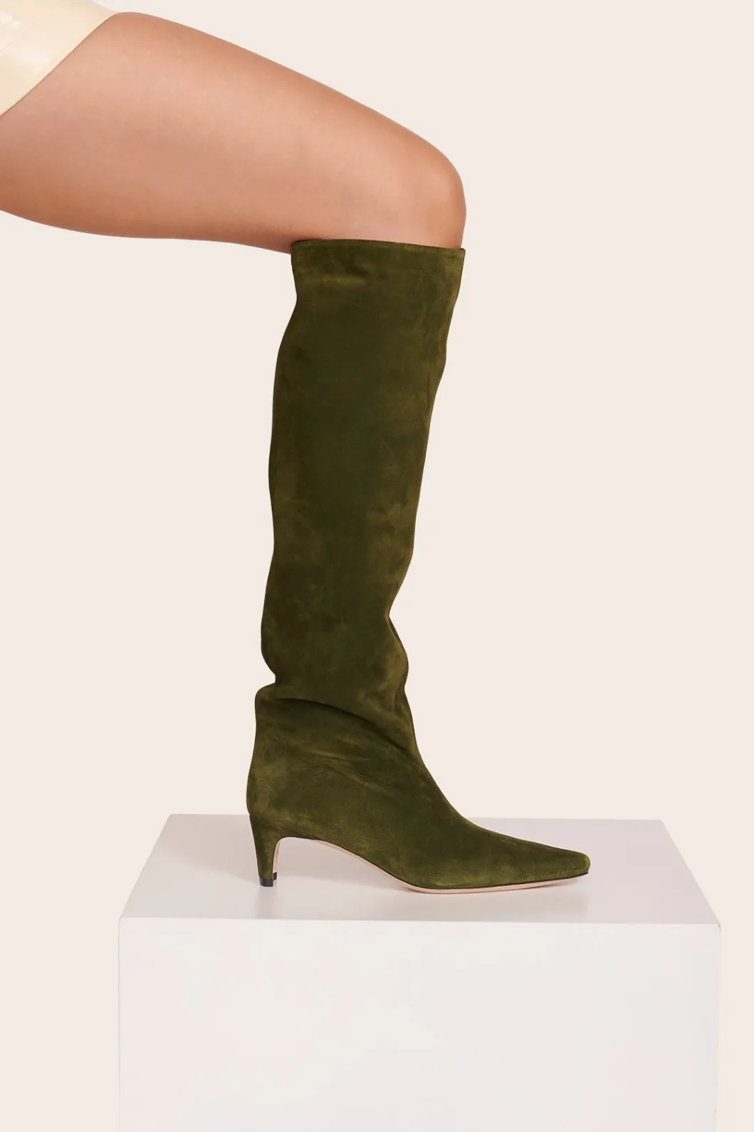 The Wally is a slouchy, suede knee-high boot featuring a pointed toe and a slim heel design.