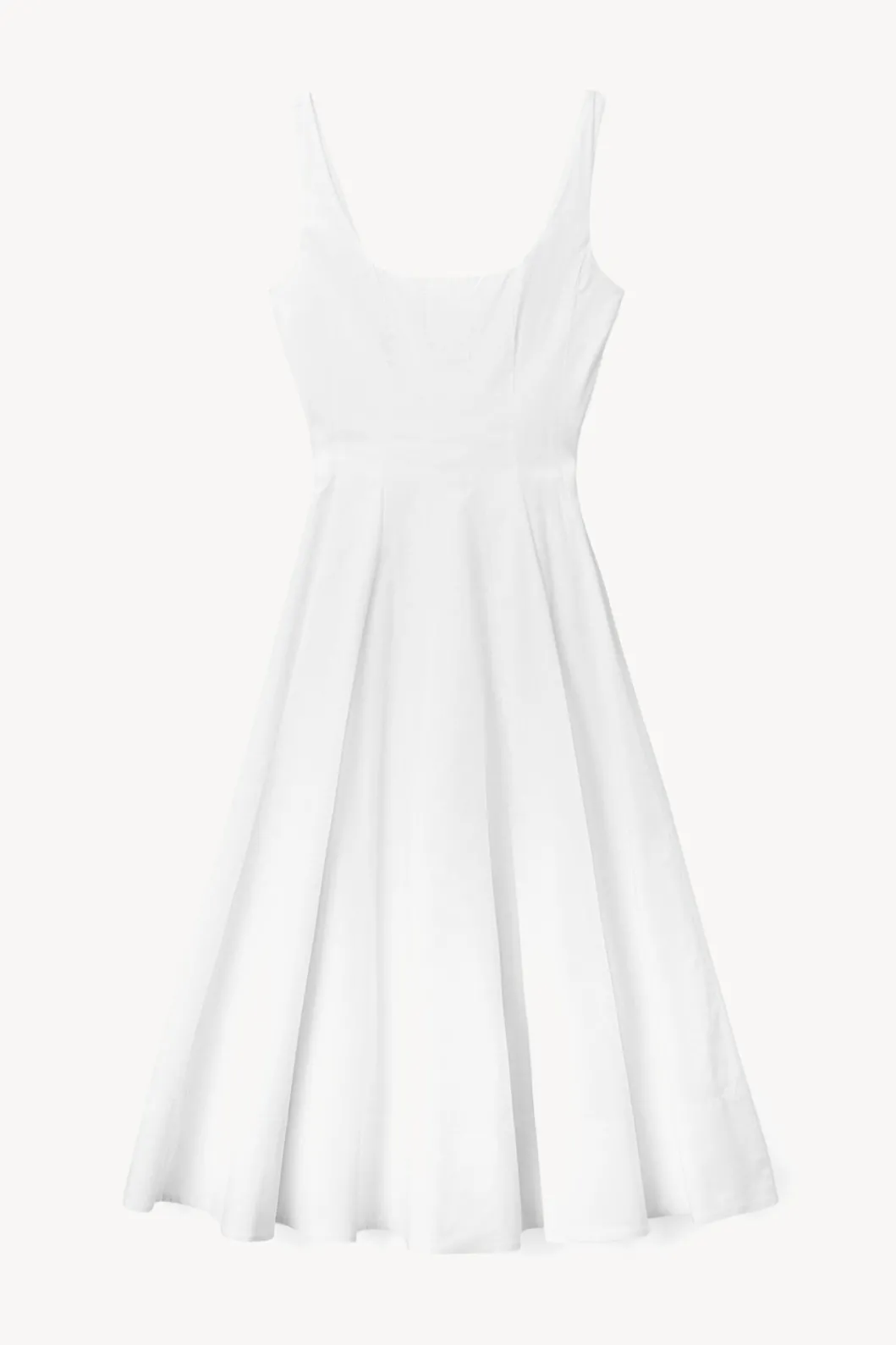 The Wells Dress features a corset-style panel construction to create a flattering, fitted shape through the waist and a midi length a-line skirt. Made out of lightweight cotton poplin.