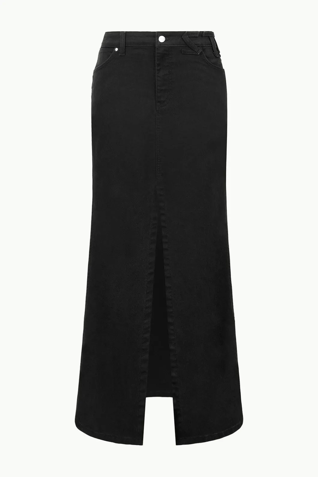 The Maxi Skirt is the full length update to our Pencil Skirt. The mid-rise sits just below the natural waist and has a button and zip fly closure. This style features our STAUD belt loop detail at the waist and a front slit.